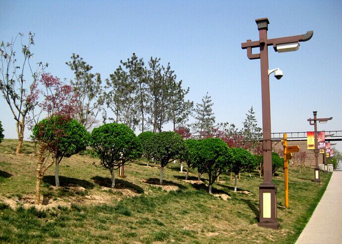 這款仿古路燈是結合商丘這個地方的傳統建筑造型而專門設計制作的,目的是能和周圍環境相互襯托,更好的融入當地的建筑風格。這款路燈的漆顏色為古典紫,整燈主桿采用的是160mm方管折彎焊接而成,使得這款不是很高的路燈顯得魁梧大氣,光源配置的是3盞歐普13wLED投射燈,夜間在正常供優質的照明質量的同時,還具有很出眾的觀賞價值。