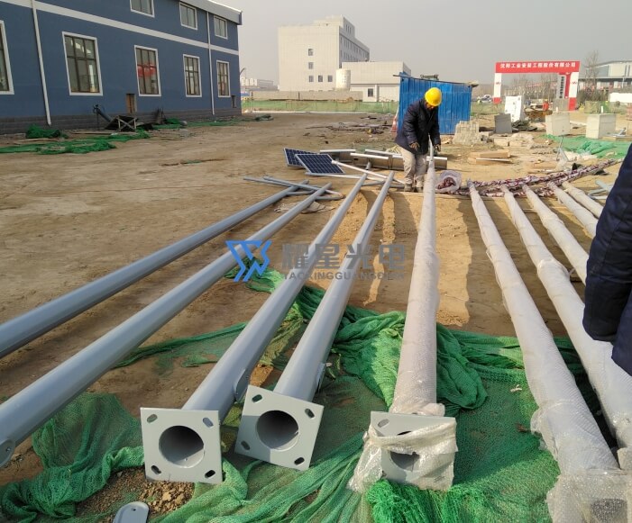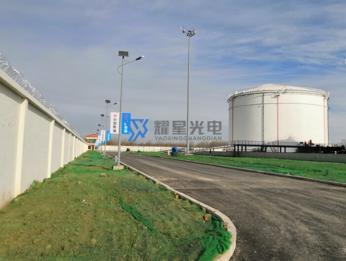 北京首都機場油庫區照明工程,場區共配置5套30米升降高桿燈和116套8米市電互補太陽能路燈